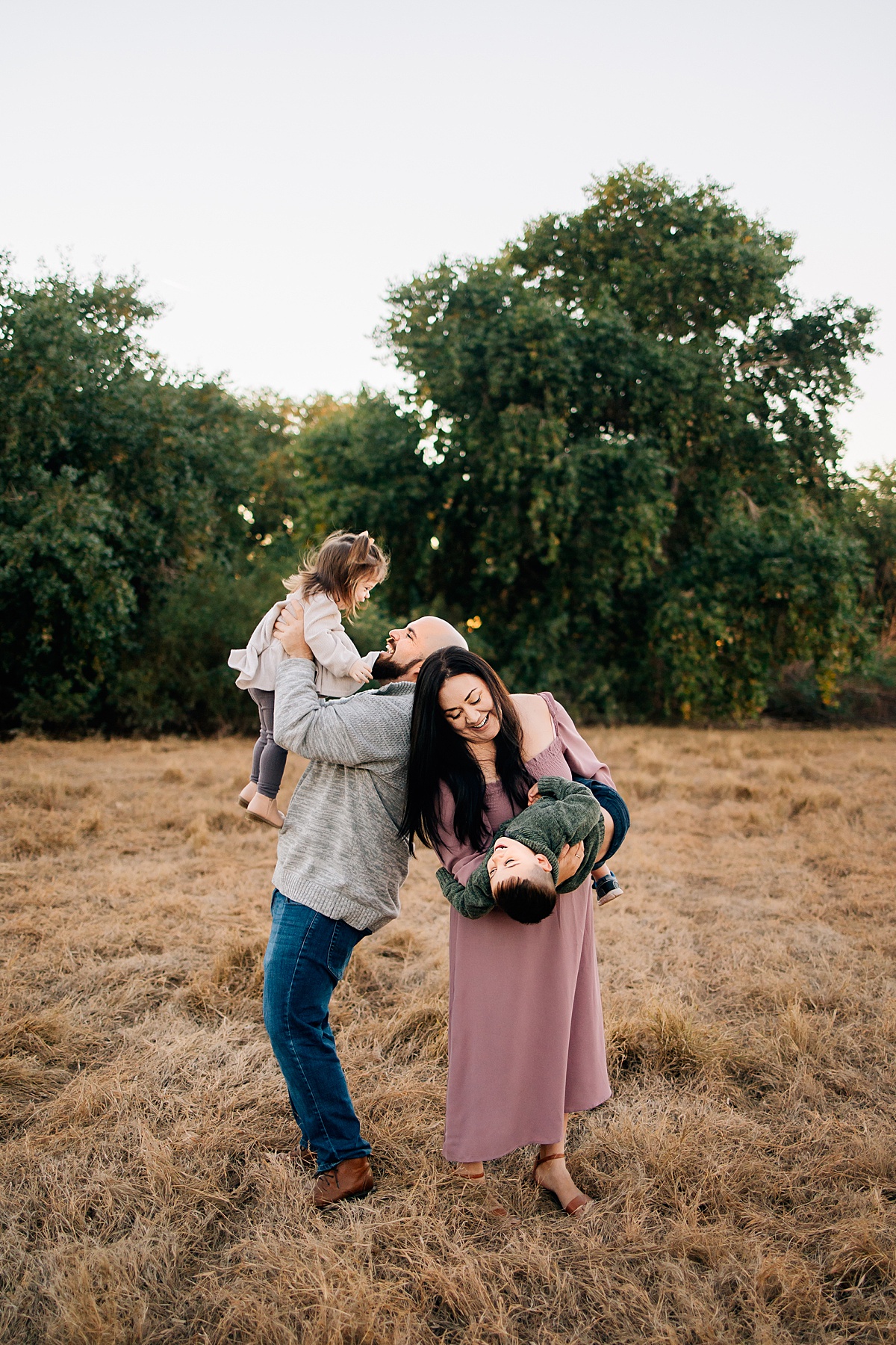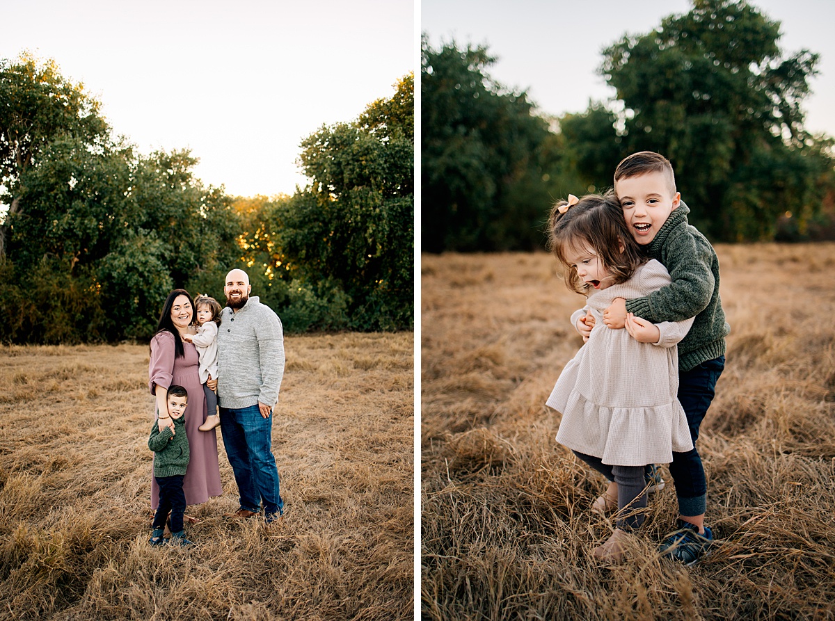 The soft, golden light filtering through the trees during sunset creates such a romantic and effortless look — especially when families focus on connection instead of stiff poses.